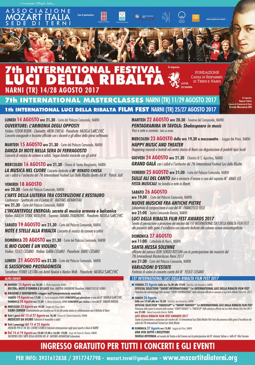Da non perdere, infine, i recital che si terranno il 18, 20 e 21 Agosto, tenuti da pregiatissimi e stimati artisti internazionali come Felice Cusano, Femke Ijlstra e Madlen Stokic. La manifestazione è patrocinata dalla Regione Umbria, Provincia di Terni, Camera di Commercio di Terni, Comune di Terni, Comune di Narni, Stiftung Mozarteum Salzburg e Forum austriaco di cultura. Come ogni anno, tutti gli eventi saranno a ingresso libero.