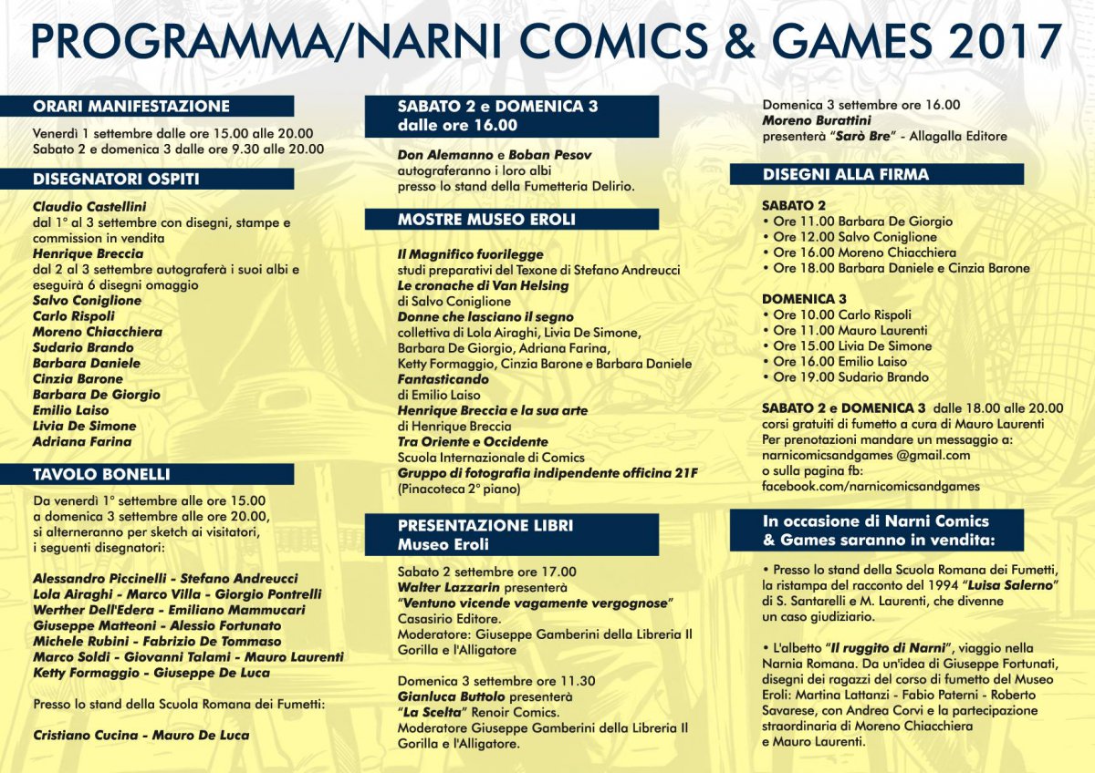 Dal 1 al 3 settembre 2017 il Museo Eroli e la piazza dei Priori di Narni si vestono a festa per Narni Comics&Games, una kermesse dedicata ai fumetti d’autore con la partecipazione di 34 disegnatori di fama internazionale.